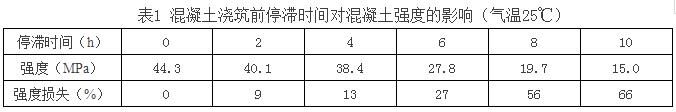 (6)在初凝時間內(nèi)的混凝土,由于氣溫較高、運(yùn)距較遠(yuǎn)、壓車時間較長等造成混凝土坍落度損失較大,可通過試驗添加同型號的泵送劑或減水劑,但添加與原先已加的總和摻量不能超過外加劑最大摻量的20%。應(yīng)逐漸添加,先少加,摻入后,攪拌運(yùn)輸車必須快速轉(zhuǎn)動2min左右,測定坍落度符合要求。運(yùn)到現(xiàn)場的混凝土不能立即卸料,應(yīng)快速轉(zhuǎn)動運(yùn)輸車2min后卸料,以確保坍落度和質(zhì)量。對超過初凝時間的混凝土應(yīng)廢棄,不能再使用?;炷翝仓巴臅r間越長,混凝土強(qiáng)度損失越嚴(yán)重(如表1),應(yīng)當(dāng)引起足夠重視。