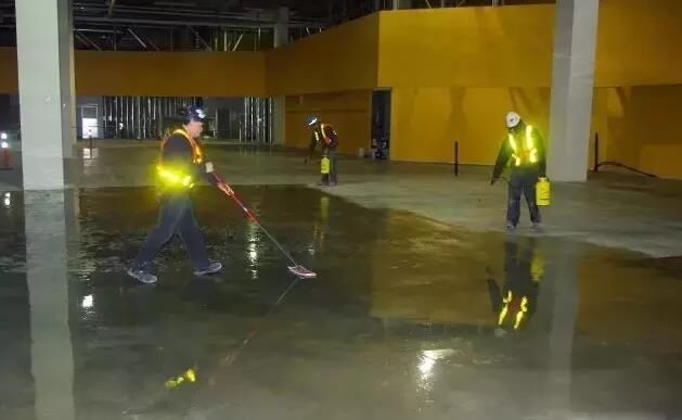 一旦混凝土表面的張合力被打開,混凝土經(jīng)過20到40多分鐘來吸收硬化劑。接著,可以對同一時間段進行施工的整個區(qū)域做一個評估。如果大多數(shù)材料都已經(jīng)滲透到混凝土里,那就就將剩下的材料從濕潤區(qū)域勻到干燥區(qū)域。在起粘稠區(qū)域處添加點水,把地面刷均勻,然后讓它自然干。如果材料已經(jīng)全部滲透進去,表面沒有任何殘留物,那就不需要再清洗地面了。