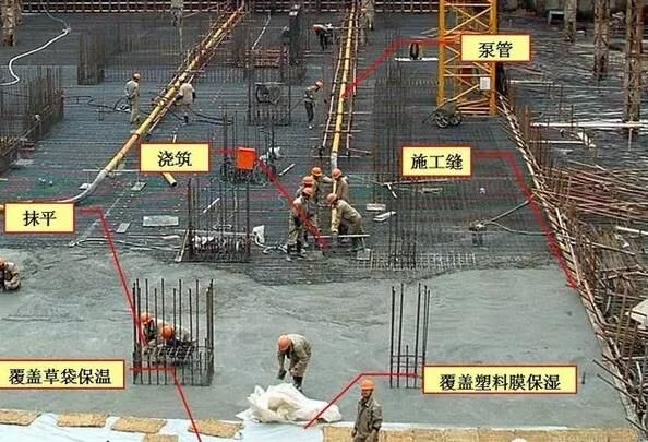 6、大體積泵送混凝土經(jīng)振搗后表面水泥漿較厚,容易引起表面裂縫。首先,要求在振搗最上一層混凝土?xí)r,控制振搗時間,注意避免表層產(chǎn)生太厚的浮漿層;在澆搗后,必須及時用2m 長括尺,將多余浮漿層刮除,按照標(biāo)高控制點,將混凝土表面括拍平整。有凹坑的部位必須用混凝土填平,在混凝土收漿接近初凝時,混凝土面進行二次抹光,用木蟹全面仔細打抹兩遍,既要確?;炷恋钠秸龋忠哑涑跗诒砻娴氖湛s脫水細縫閉合,在混凝土收漿凝固施工期間,除了具體施工人員外,不得在未干硬的混凝土面上隨意行走,收漿工作完成的面必須同步及時覆蓋薄膜。