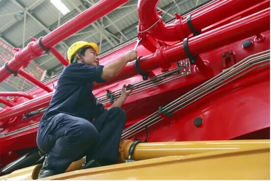 由于泵車生產(chǎn)線是高度柔性化的生產(chǎn),產(chǎn)品型號(hào)有37米、49米、56米、66米、86米等幾十種型號(hào),還要滿足客戶的各種定制化需求,這就要求工人們在熟練掌握每一款產(chǎn)品的標(biāo)準(zhǔn)化作業(yè)同時(shí),牢記每一顆螺母、每一根膠管、每一個(gè)閥塊的正確安裝方法,對(duì)泵車制造工藝做到了然于心,用最快的速度保證每一臺(tái)泵車的順利下線。