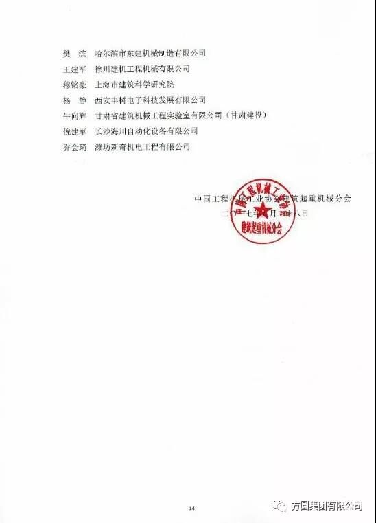 在11月9日召開的中國工程機(jī)械工業(yè)協(xié)會建筑起重機(jī)械分會年會上,以中工機(jī)協(xié)【2017】建起字11號文件公布了《關(guān)于建筑起重機(jī)械行業(yè)首批18名專家的聘用決定》,聘用首批18名專家為建筑起重機(jī)械行業(yè)專家,方圓集團(tuán)副總工程師吳明臣名列其中。