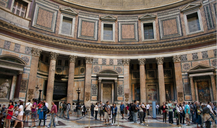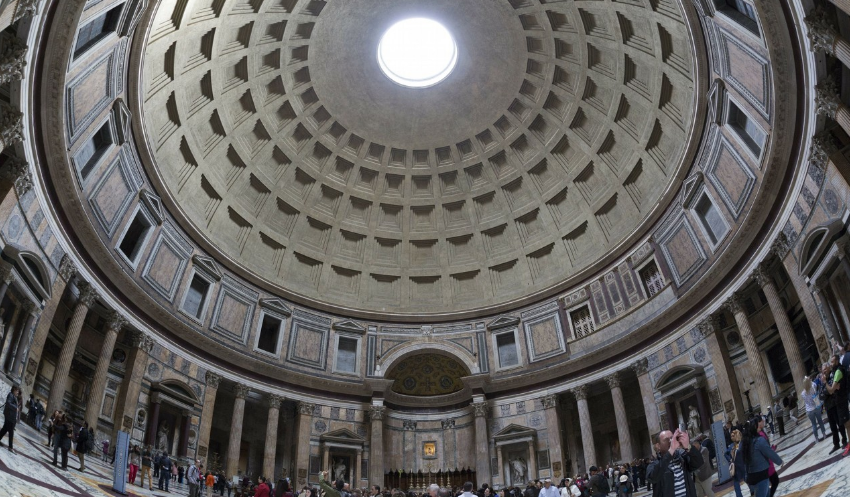萬神殿下半部為空心圓柱形,從高度一半的地方開始,上半部為半球形的穹頂。 萬神殿的基礎(chǔ)部分底部寬7.3米,墻和穹頂?shù)撞亢襁_6米,穹頂頂部厚1.5米。為了減輕穹頂?shù)闹亓?,建筑師巧妙地在穹頂?nèi)表面作了28個凹格,分成5排,同時,在墻上有門的的前提下還開了7個凹室作為祭龕,這些祭龕里原來放的可能是神像,一些名人的墓穴。