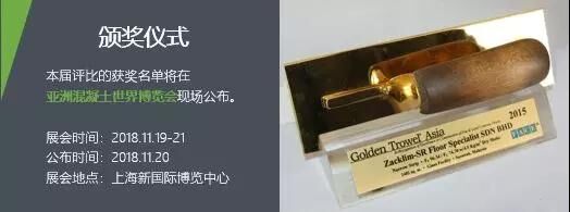 其中,亞洲金鏝刀獎(jiǎng)報(bào)名已于2018年9月30日截止、已在緊張?jiān)u選中,并將于2018年11月20日在上海新國際博覽中心舉辦的亞洲混凝土世界博覽會(huì)上隆重公布獲獎(jiǎng)名單并舉行頒獎(jiǎng)儀式;獲獎(jiǎng)?wù)哌€將受邀參加于2019年1月22-25日期間在美國拉斯維加斯會(huì)展中心舉辦的美國混凝土世界博覽會(huì)。