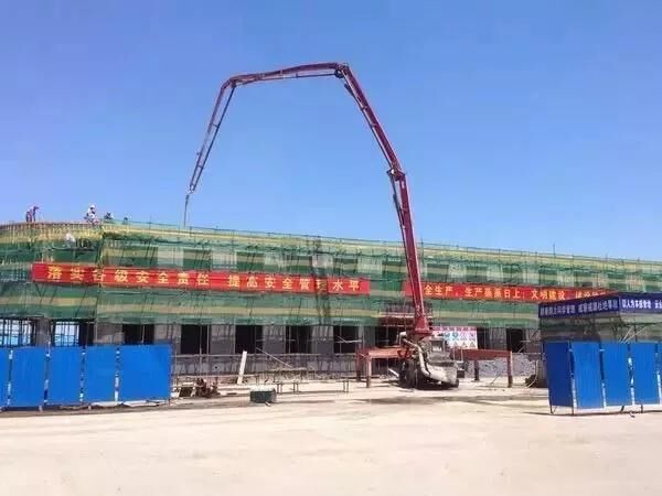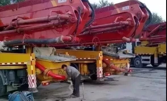 五、當布料桿處于全部伸出并支固,不能移動車身。作業(yè)中需要移動時,應將上段布料桿折疊固定,移動速度不超過10KM/h。布料桿不得使用超過規(guī)定直徑的配管,裝接的軟管應系防安全繩帶。