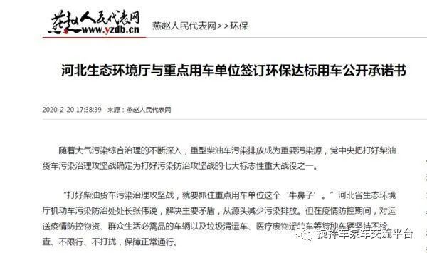 近日,據(jù)燕趙人民代表網(wǎng)報(bào)道,河北生態(tài)環(huán)境廳與重點(diǎn)用車單位簽訂環(huán)保達(dá)標(biāo)用車公開承諾書,加強(qiáng)對(duì)重型柴油車的相關(guān)治理。承諾書包括:進(jìn)出單位的所有重型柴油車、重型燃?xì)廛囘_(dá)到國五及以上排放標(biāo)準(zhǔn)。