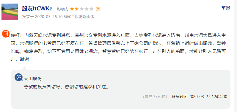 同期有投資者在上市平臺向天山股份董秘提問并建議說:內(nèi)蒙天皓水泥專列進(jìn)京,貴州興義專列水泥進(jìn)入廣西,吉林專列水泥進(jìn)入濟(jì)南,越南水泥大量進(jìn)入中國,水泥腿短的老黃歷已經(jīng)不復(fù)存在,希望管理層借鑒以上三家公司的做法,在營銷上適時做出調(diào)整,警鐘長鳴,銳意進(jìn)取,切不可套用老思維老觀念,智慧營銷已經(jīng)勢在必行,走在別人的前面,才能讓別人無路可走。