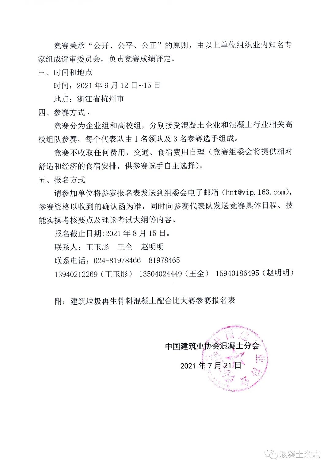 為配合《住房和城鄉(xiāng)建設(shè)部關(guān)于推進(jìn)建筑垃圾減量化的指導(dǎo)意見》(建質(zhì)〔2020〕46號(hào))的發(fā)布,進(jìn)一步推動(dòng)混凝土行業(yè)建筑垃圾消納和碳減排,為我國2030年前實(shí)現(xiàn)碳達(dá)峰、2060年前實(shí)現(xiàn)碳中和的目標(biāo)做出混凝土行業(yè)的貢獻(xiàn),現(xiàn)決定于2021年9月12日~15日于浙江省杭州市舉辦建筑垃圾再生骨料混凝土配合比大賽。