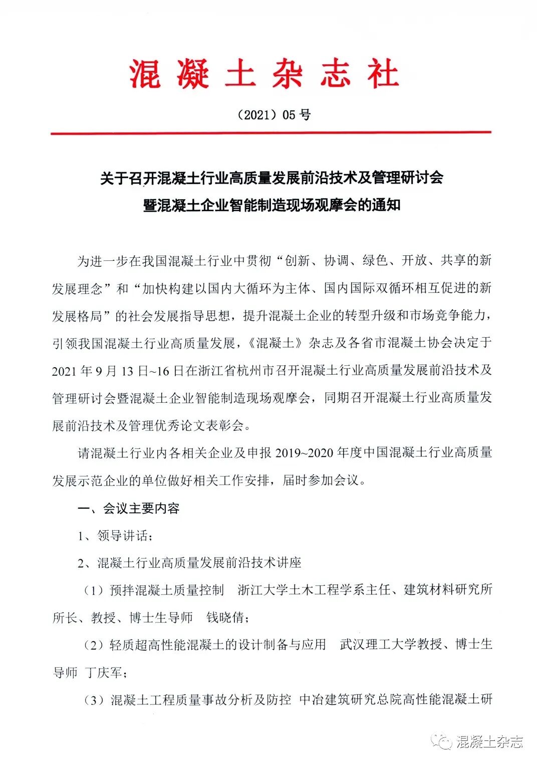 (9.13杭州)關于舉辦混凝土行業(yè)高質量發(fā)展前沿技術及管理研討會暨混凝土企業(yè)智能制造現(xiàn)場觀摩會的通知
