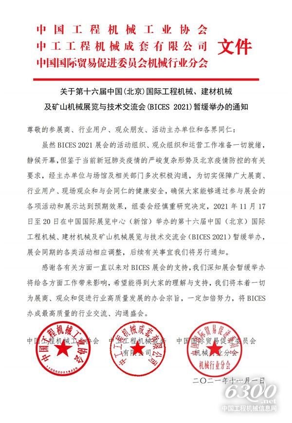 BICES 2021組委會于2021年11月1日下午下發(fā)了關于第十六屆中國(北京)國際工程機械、建材機械及礦山機械展覽與技術交流會(BICES 2021)暫緩舉辦的通知,延期時間未定。