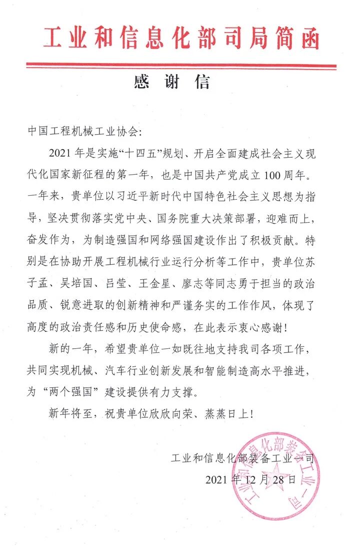 近日,工業(yè)和信息化部裝備工業(yè)一司致函中國工程機械工業(yè)協(xié)會,對協(xié)會一年來,堅持以習近平新時代中國特色社會主義思想為指導,堅決貫徹落實黨中央、國務(wù)院重大決策部署,迎難而上,奮發(fā)作為,在制造強國和網(wǎng)絡(luò)強國建設(shè)工作,特別是積極配合協(xié)助開展工程機械行業(yè)運行分析等工作表示感謝!
