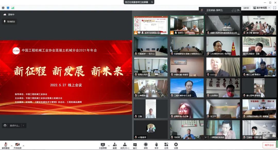 2022年5月27日,以“新征程 新發(fā)展 新未來 ”為主題的中國工程機(jī)械工業(yè)協(xié)會混凝土機(jī)械分會年會在線上隆重召開。中國工程機(jī)械工業(yè)協(xié)會會長蘇子孟、名譽會長祁俊、協(xié)會顧問龍國鍵、副秘書長呂瑩、副秘書長王金星、副秘書長尹曉荔、其他分支機(jī)構(gòu)領(lǐng)導(dǎo)、混凝土機(jī)械分會會長符忠軒、名譽會長盛春芳、秘書長李祥蘭、顧問易君、分會秘書處、分會理事及會員單位相關(guān)負(fù)責(zé)人、行業(yè)上下游企業(yè)與行業(yè)專家等在內(nèi)的兩百余人參與此次會議。