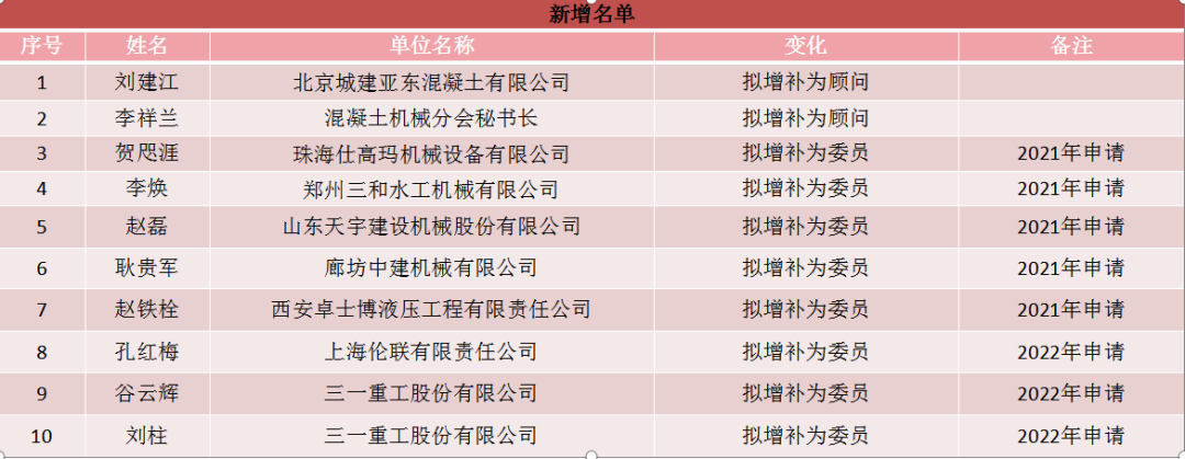 2022年4月29日經(jīng)混凝土機(jī)械分會理事會決議,團(tuán)標(biāo)委員增補10人,變更2人,取消2人。委員人數(shù)由31人調(diào)整至39人。
