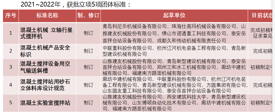 以市場需求為導(dǎo)向,圍繞產(chǎn)品鏈,今年重點從“關(guān)鍵部件/系統(tǒng),新材料、新能源,智能產(chǎn)品、智能互聯(lián)”方1立項團(tuán)體標(biāo)準(zhǔn),引導(dǎo)和服務(wù)混凝十機(jī)械行、發(fā)展。 2022年擬申請團(tuán)體標(biāo)準(zhǔn)立項10項以上。