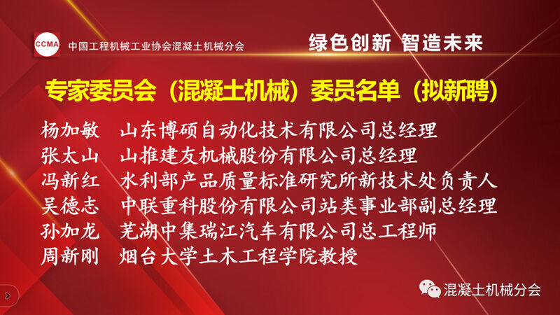 中國工程機(jī)械工業(yè)協(xié)會(huì)混凝土機(jī)械分會(huì)會(huì)長符忠軒宣讀兩份通知。一份為《關(guān)于2022年中國工程機(jī)械工業(yè)協(xié)會(huì)專家委員會(huì)(混凝土機(jī)械)委員聘任的通知》,其中中國工程機(jī)械工業(yè)協(xié)會(huì)專家(混凝土機(jī)械)委員會(huì)(混凝土機(jī)械)續(xù)聘7位,新聘6位委員,共13位。