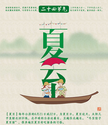 夏至是二十四節(jié)氣中最早被確定的一個(gè)節(jié)氣。公元前七世紀(jì),先人采用土圭測(cè)日影,就確定了夏至。每年的夏至從6月21日(或22日)開(kāi)始,至7月7日(或8日)結(jié)束。據(jù)《恪遵憲度抄本》:“日北至,日長(zhǎng)之至,日影短至,故曰夏至。至者,極也?!毕闹吝@天,太陽(yáng)直射地面的位置到達(dá)一年的最北端,幾乎直射北回歸線(北緯23°26\'),北半球的白晝達(dá)最長(zhǎng),且越往北晝?cè)介L(zhǎng)。如海南的??谑羞@天的日長(zhǎng)約13小時(shí)多一點(diǎn),杭州市為14小時(shí),北京約15小時(shí),而黑龍江的漠河則可達(dá)17小時(shí)以上。夏至以后,太陽(yáng)直射地面的位置逐漸南移,北半球的白晝?nèi)諠u縮短。民間有“吃過(guò)夏至面,一天短一線”的說(shuō)法。而此時(shí)南半球正值隆冬。