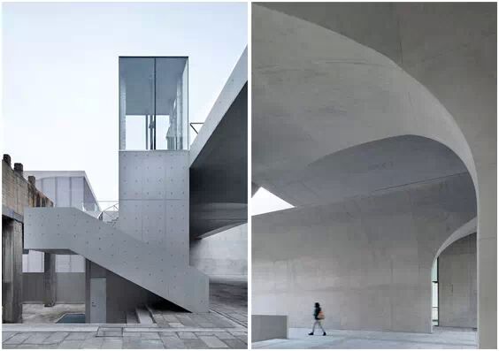 在“傘拱”結(jié)構(gòu)的空腔里,地面以上的“傘拱”覆蓋空間,墻體和天花均為清水混凝土的表面,它們的幾何分界位置也變得模糊。這樣的結(jié)構(gòu)性空間,在形態(tài)上不僅對人的身體形成庇護感,亦與保留的江邊碼頭的煤料斗產(chǎn)生視覺呼應(yīng)。建筑的內(nèi)部空間也得以呈現(xiàn)一種原始的野性魅力,而有著大小調(diào)節(jié)的空間尺度以及留有模板拼縫和螺栓孔的清水混凝土表面又會帶來一種現(xiàn)實感。這種“直白”式的結(jié)構(gòu)、材料、空間所形成的直接性與樸素性,加上大尺度出挑所產(chǎn)生的力量感或輕盈感,使整個建筑與原有場地的工業(yè)特質(zhì)間取得一種時間與空間的接續(xù)關(guān)系。地面以上的清水混凝土“傘拱”下的流動展覽空間和地下一層傳統(tǒng)“白盒子”式的展覽空間由一個呈螺旋回轉(zhuǎn)、層層跌落的階梯空間聯(lián)接,既原始又現(xiàn)實的空間和古代、近代、現(xiàn)代直到當(dāng)代藝術(shù)的展覽陳列,這種并置的張力,呈現(xiàn)出一種具有時間性的展覽空間。