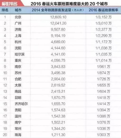 為了更直觀地反映春運(yùn)火車票的購票難度,我們用全年旅客發(fā)送量轉(zhuǎn)換成“搶票概率”,比如說,北京全年旅客發(fā)送量是1.2億人次,那你每次買票的成功概率就是1.2億分之一。那么,春運(yùn)旅客發(fā)送量如何計(jì)算?春運(yùn)一般為期40天,而且集中度很高,根據(jù)我們的評(píng)估,期間的量相當(dāng)于平時(shí)的3倍,比如,北京春運(yùn)火車旅客發(fā)送量是“12609.10萬人次÷12個(gè)月x3倍=3152萬人次”。這個(gè)數(shù)據(jù),與鐵路部門公布的2015北京春運(yùn)火車旅客發(fā)送量(2796.2萬人次)非常接近,我們認(rèn)為還是非??孔V的。這樣,北京地區(qū)春運(yùn)火車票搶票概率就是1/3152萬。概率越低,搶票的難度越大。