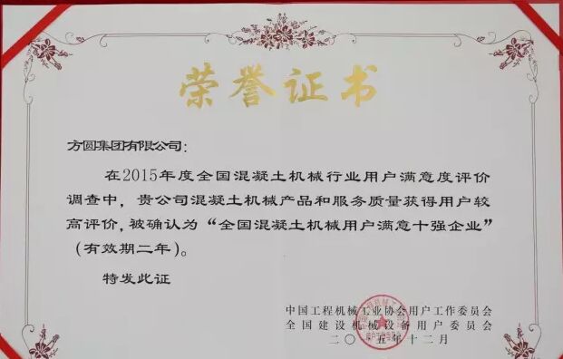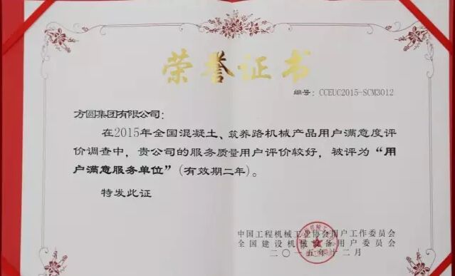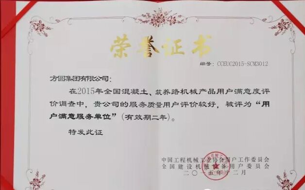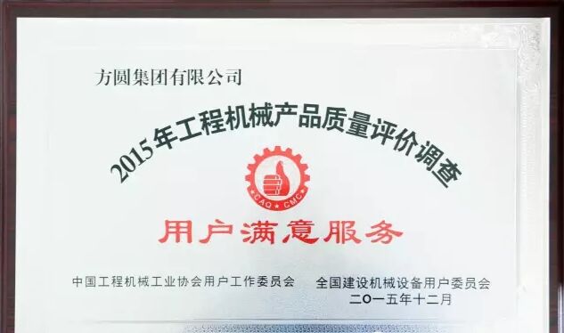 此外,因?yàn)榉綀A集團(tuán)在2015年度全國混凝土機(jī)械行業(yè)用戶滿意度評價調(diào)查中,受到廣大用戶的一致好評,被授予“全國混凝土機(jī)械用戶滿意十強(qiáng)企業(yè)”稱號。在產(chǎn)品質(zhì)量調(diào)查中,連續(xù)七次被評為“全國用戶滿意單位”。