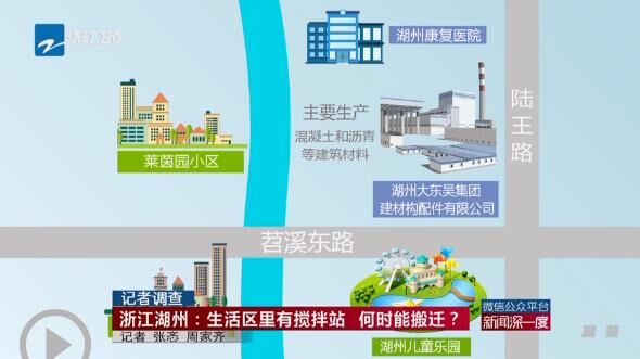 湖州大東吳集團建材構(gòu)配件有限公司位于湖州市苕溪東路和陸王陸交叉口北側(cè),主要生產(chǎn)混凝土和瀝青等建筑材料。在它的西面,隔著一條河,就是萊茵園小區(qū)和尊園小區(qū)。它的北面是湖州康復(fù)醫(yī)院和養(yǎng)老院,南面則是即將竣工的湖州兒童樂園(圖)