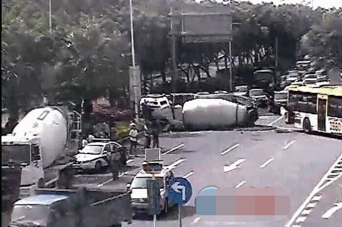 攪拌車撞擊后,可能猛打了方向盤,突然失控,側(cè)翻在地,占了兩個(gè)車道,加上泥漿傾倒下來,對(duì)交通影響很大。