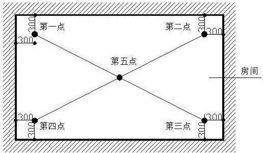 五、頂板水平度極差1、指標說明:考慮實際測量的可操作性,選取同一功能房間混凝土頂板內(nèi)四個角點和一個中點距離同一水平基準線之間5個實測值的極差值,綜合反映同一房間混凝土頂板的平整程度。2、測量工具:激光掃平儀、具有足夠剛度的5米鋼卷尺(或2米靠尺、激光測距儀)3、測量方法和數(shù)據(jù)記錄:(1)同一功能房間混凝土頂板作為1個實測區(qū),累計實測實量不得少于3個實測區(qū)。(2)使用激光掃平儀,在實測板跨內(nèi)打出一條水平基準線。同一實測區(qū)距頂板天花線約30cm處位置選取4個角點,以及板跨幾何中心位(若板單側(cè)跨度較大可在中心部位增加1個測點),分別測量混凝土頂板與水平基準線之間的5個垂直距離。以最低點為基準點,計算另外四點與最低點之間的偏差。最大偏差值≤15mm時,5個偏差值(基準點偏差值以0計)的實際值作為判斷該實測指標合格率的5個計算點。最大偏差值﹥15mm時,5個偏差值均按最大偏差值計,作為判斷該實測指標合格率的5個計算點。4、示例: