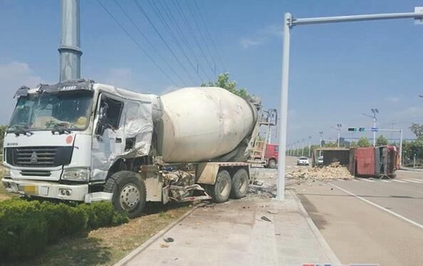 當日,劉某駕駛混凝土攪拌車在南海新區(qū)沿著龍海路由北向南行駛,行至龍海路與海韻路交會處闖紅燈行駛,與沿海韻路由東向西正常行駛的大貨車發(fā)生碰撞,導(dǎo)致大貨車翻車,拉載的石塊散落一地?;炷翑嚢柢噭t沖進了路邊綠化帶內(nèi),將兩棵行道樹和一根燈桿撞倒,路邊人行道上的部分石板被掀起。