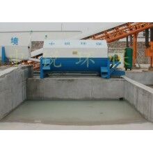 該系統(tǒng)主要由:攪拌車加水清洗裝置,溜槽輸送裝置,砂石漿水分離裝置,和泥漿水后處理裝置組成。混凝土輸送設備清洗后,將殘余混凝土排入溜槽中,在高壓水流沖擊下,經(jīng)溜槽進入砂石分離機,在不斷旋轉(zhuǎn)的分離機作用下,對混凝土進行充分的清洗,同時將砂、石進行分離,分離后的砂、石在導料葉片的作用下背向流動,再通過提升式出料口排出分離機,分別堆放。清洗后的漿水從分離機的底部排出進入沉淀池逐級沉淀后循環(huán)使用或進入攪拌池回收利用。進入攪拌池(一般情況2個攪拌池)的漿水為了防止沉淀凝固,需通過攪拌器的作用,攪拌器的工作為間歇式。分離出水泥漿在連續(xù)的攪拌器作用下,再通過高壓污水泵輸送到攪拌樓中待生產(chǎn)計量再利用。整個控制系統(tǒng)設有手動和自動控制,方便控制設置,整個系統(tǒng)運行可靠,故障率低,維護量少等特點。