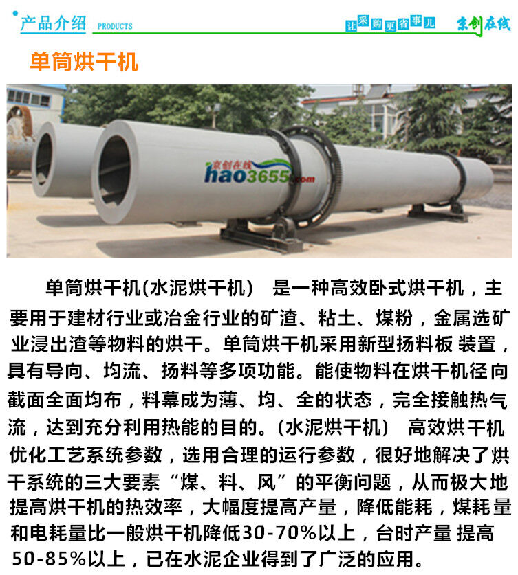 單筒烘干機φ3×25,也叫滾筒干燥機,它廣泛用于建材、冶金、化工、水泥工業(yè)烘干礦渣石灰石、煤粉、礦渣、粘土等物料。該機主要由回轉(zhuǎn)體、揚料板,傳動裝置,支撐裝置及密封圈等部件組成。具有結構合理,制作精良,產(chǎn)量高,能耗低,運轉(zhuǎn)方便等優(yōu)點。
