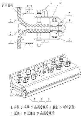 b、用主帶夾將提升帶兩端通過螺栓夾緊;