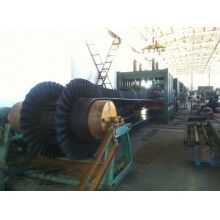 大傾角波狀擋邊帶由基帶、擋邊、橫隔板3部分組成。擋邊起防止物料測滑撒落的作用。為便于繞過滾筒,檔邊設計成波紋狀;橫隔板的作用是承托物料,為了實現(xiàn)大傾角輸送,采用T型TC型。檔邊和橫隔板是用二次硫化的方法與基帶連接的,具有很高的連接強度。