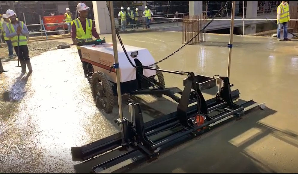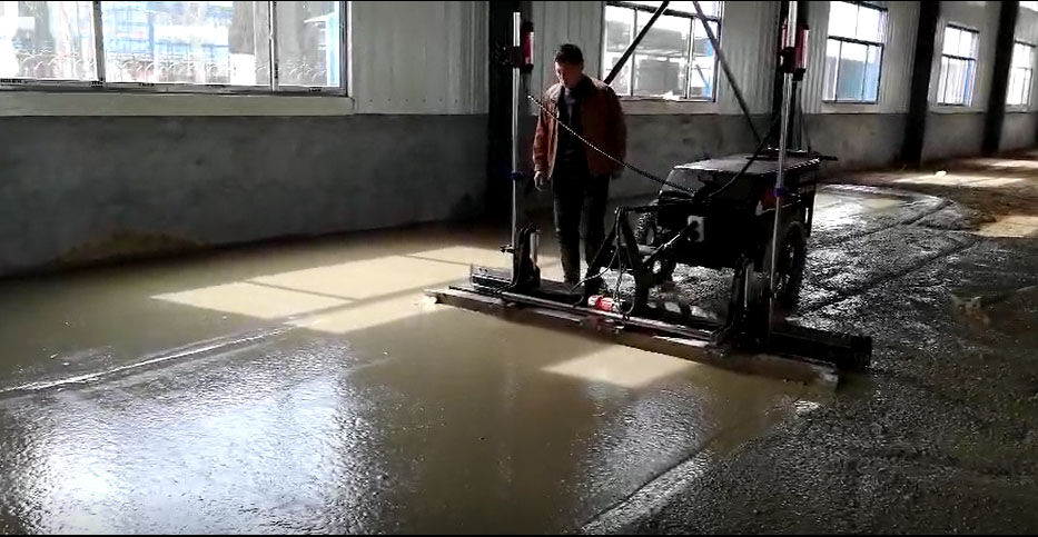 混凝土激光攤鋪機(jī)是用刮板將高出的混凝土帶走并初步刮平,達(dá)到設(shè)計(jì)要求的標(biāo)高。液壓驅(qū)動(dòng)振動(dòng)馬達(dá)產(chǎn)生震動(dòng),頻率為4000次/分鐘,帶動(dòng)整個(gè)振動(dòng)板一起對(duì)混凝土產(chǎn)生振搗。激光攤鋪機(jī)找平不需要拉控制線,也不需要支側(cè)模板來控制地面標(biāo)高,而由攤鋪機(jī)上的激光測(cè)控系統(tǒng)實(shí)時(shí)控制,只要激光發(fā)射器不受干擾,無論攤鋪機(jī)移動(dòng)到哪里,都能確保鋪筑后的地面整體上的標(biāo)高不受影響。