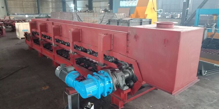 板式給料機(jī)的動(dòng)力由傳動(dòng)裝置的電動(dòng)機(jī)驅(qū)動(dòng),經(jīng)減速機(jī)減速后,再經(jīng)傳動(dòng)鏈輪把動(dòng)力傳到主動(dòng)軸上。此時(shí),裝在主動(dòng)軸上的兩個(gè)鏈輪就跟軸轉(zhuǎn)動(dòng)。另外與頭部、尾部鏈輪相嚙合的兩條鏈條也隨著主動(dòng)鏈輪和尾輪的轉(zhuǎn)動(dòng)而向前移動(dòng),鏈板安裝在鏈條上面與鏈條作同步運(yùn)動(dòng)。