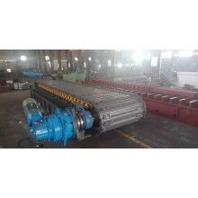 重型板式給料機是由電動機轉(zhuǎn)動,再經(jīng)過聯(lián)軸器、減速器等帶動主軸旋轉(zhuǎn),并通過主軸裝置上的鏈輪與鏈條嚙合帶動鏈條上的鏈板運動,達到運送物料的目的,鏈板間隙可除去原料中的細粒泥土。在驅(qū)動裝置的減速器上常裝有逆止器(安裝傾角大于15°時),以防止停機時發(fā)生倒轉(zhuǎn),并可通過變頻裝置調(diào)節(jié)給料速度。重型板式給料機是礦石輸送系統(tǒng)的重要設(shè)備,常用在原料倉底,可連續(xù)、均勻的向初級破碎機給料,能在露天、潮濕等惡劣環(huán)境下可靠地工作,該機已在大型選礦廠破碎車間及水泥企業(yè)等廣泛使用。