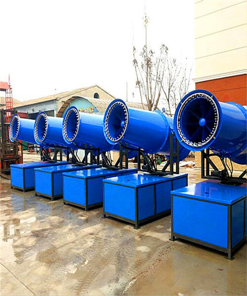 除塵噴霧炮是根據(jù)送風(fēng)原理,先使用進口高壓泵、微細霧化噴嘴將水霧化,利用風(fēng)機風(fēng)量和風(fēng)壓將霧化后的水霧送到較遠距離,使得水霧到達較遠距離能夠覆蓋大面積,水霧與粉塵凝結(jié)后降落,從而達到降塵目的。