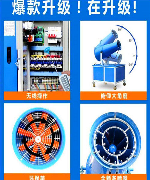霧炮機功力強、射程遠、覆蓋范圍廣、可以實現(xiàn)精量噴霧;工作效率高、噴霧速度快;對容易引起塵埃的堆場噴水除塵時,噴出的霧粒細小、與飄起的塵埃接觸時,形成一 種潮濕霧狀體,能快速將塵埃抑制降沉;配套動力靈活,既可用三相380V的市電,也可配套柴油發(fā)電機組供電;可固定安裝在混凝土澆筑的平臺上,也可配套柴 油發(fā)電機組供電安裝在運輸車輛上;操作靈活,使用安全可靠,遙控和人工控制操作,可隨意控制調(diào)節(jié)水平旋轉(zhuǎn)噴霧角度;耗水量其它抑塵噴灑設備可節(jié)約 ~(噴槍、灑水機車),且水霧覆蓋粉塵面積遠遠大于其它抑塵噴灑設備。