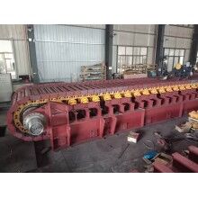 負(fù)荷鏈板材料選用優(yōu)質(zhì)合金鋼板沖壓而成。給料板式給料機(jī)每塊負(fù)荷鏈板上焊有折彎角鐵,既能滿足大傾角向上運(yùn)送物料,又提高負(fù)荷鏈板的強(qiáng)度。在鏈板寬度較寬的情況下增加輔助支撐,該項(xiàng)結(jié)構(gòu)不但增加了鏈板的強(qiáng)度,而且使運(yùn)輸過(guò)程更加平穩(wěn)可靠。拉料板式給料機(jī)為了增加鏈板表面的摩擦,防止物料打滑,在負(fù)荷鏈板上增加了一定數(shù)量的耙齒,對(duì)防止搭橋有一定的緩沖作用,保證了給料的均勻性。