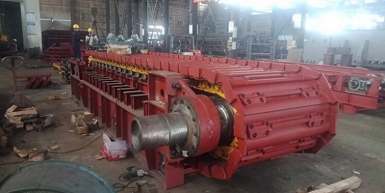 設備由傳動部件、機座部件、工作部件等組成。工作部件又由主動軸組件、鏈板組件、改向軸與張緊裝置等組成。因與移動式破碎站配套,其傳動部件懸掛在主軸上,以簡化基礎結構和設備搬遷中的安裝、調整工作量。由于輸入功率大,采用動力部件懸掛到主軸上的同時,采用雙端輸入,減輕單傳動部件重量,使機座受力均衡,消除側向扭矩。