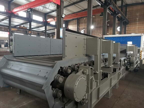 移動(dòng)破碎站給料系統(tǒng)的功能是向各段破碎機(jī)和篩分機(jī)送入原料。減緩給料過程對(duì)破碎機(jī)的工作裝置造成的沖擊,可以達(dá)到均勻給料、改善破碎機(jī)的工作條件等作用。根據(jù)不同的破碎篩分工藝流程,給料方式也有所區(qū)別。初級(jí)破碎機(jī)一般都采用板式給料機(jī),目的是將礦石原料按破碎機(jī)的處理速度送入破碎腔內(nèi)。產(chǎn)量很大時(shí),可用重型板式給料機(jī),這種給料機(jī)給料粒度也較大;原礦粒度較小時(shí),可用中型板式給料機(jī)。在中細(xì)碎破碎機(jī)和篩分生產(chǎn)線,為保證給料的均勻性,配置輕型板式給料機(jī)。