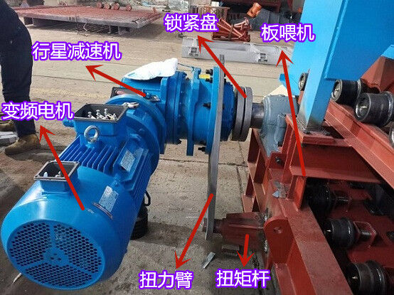 驅(qū)動機構(gòu)由電機、減速機、鎖緊盤和扭力裝置組成,驅(qū)動機構(gòu)通過鎖緊盤帶動鏈輪軸旋轉(zhuǎn),從而對物料進(jìn)行輸送。為了抵抗驅(qū)動機構(gòu)隨鏈輪軸旋轉(zhuǎn)的力,扭力裝置需要固定在地基上或者機架上。