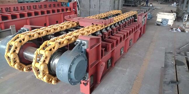 座部件由機(jī)架和支承件組成。機(jī)架由鋼材焊接而成,支承部件有支重輪、下托輪和縱向?qū)к?,輸送板得到支重輪和縱向?qū)к壍碾p重支持,使支重更均勻合理。牽引鏈基本上不受礦石和自重產(chǎn)生的張力作用,支重輪外側(cè)設(shè)計(jì)有凸臺(tái),與主、從動(dòng)輪聯(lián)合作用,成功地杜絕鏈軌跑偏。在機(jī)架下方設(shè)有下托輪,為方便維修,下托輪為側(cè)裝式。