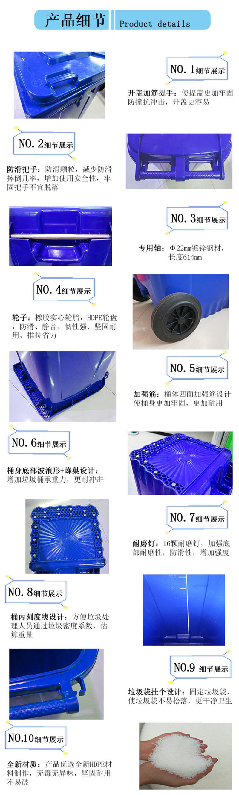 塑料分類垃圾桶經(jīng)久耐用,輕巧靈活,外型美觀,利于環(huán)保,置負(fù)載后輪,可跨越梯級或路邊臺階,內(nèi)外表面光潔,便于倒空垃圾與清洗,用于各類公共場所收集廢棄物或原料搬運(yùn),大大提高工作效率,計符合人體工程學(xué)。2 特點(diǎn)用優(yōu)質(zhì) 工程材料制造輕便耐用,移動靈活。種色彩,適用于不同的環(huán)境與垃圾分類收集。