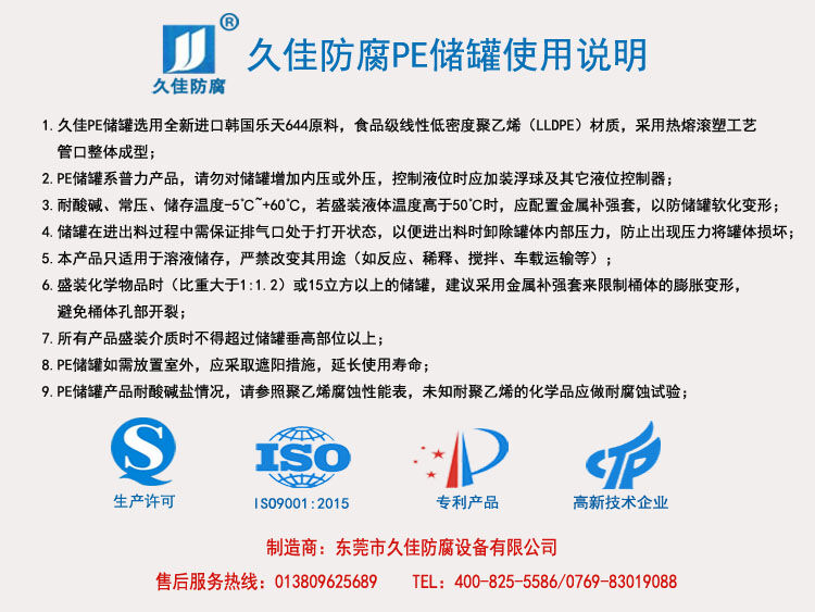 2、久佳儲罐采用進口韓國進口644線性低密度(LLDPE)原料,韌性和強度均優(yōu)于其他原料,符合中國食品衛(wèi)生檢測標(biāo)準(zhǔn)。可提供合格證、檢測報告等文件