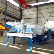 落地式砂石分離機(jī)整套系統(tǒng)主要由:攪拌車加水清洗裝置,溜槽裝置,砂石漿水分離裝置,和泥漿水后處理裝置組成?;炷凛斔驮O(shè)備清洗后,將殘余混凝土排入溜槽中,在高壓水流沖擊下,經(jīng)溜槽進(jìn)入砂石分離機(jī),在不斷旋轉(zhuǎn)的分離機(jī)作用下,對(duì)混凝土進(jìn)行充分的清洗,同時(shí)將砂石、漿水進(jìn)行分離,分離后的砂、石在導(dǎo)料葉片的作用下背向流動(dòng)至出料口排出分離機(jī)落入振動(dòng)篩分機(jī),通過(guò)篩分將沙、石子分開(kāi),分別堆放。清洗后的漿水從分離機(jī)的溢水口排出進(jìn)入濃漿池,經(jīng)污水泵加壓打到旋流器除去多余固體微粒,降低漿水濃度,進(jìn)入攪拌池回收利用。進(jìn)入攪拌池的漿水為了防止沉淀凝固,需通過(guò)攪拌器的作用,攪拌器的工作為間歇式。分離出水泥漿在連續(xù)的攪拌器作用下,再通過(guò)高壓污水泵輸送到攪拌樓中待生產(chǎn)再利用。整個(gè)控制系統(tǒng)設(shè)有手動(dòng)和自動(dòng)控制,方便控制設(shè)置,整個(gè)系統(tǒng)運(yùn)行可靠,故障率低,維護(hù)量少等特點(diǎn)。