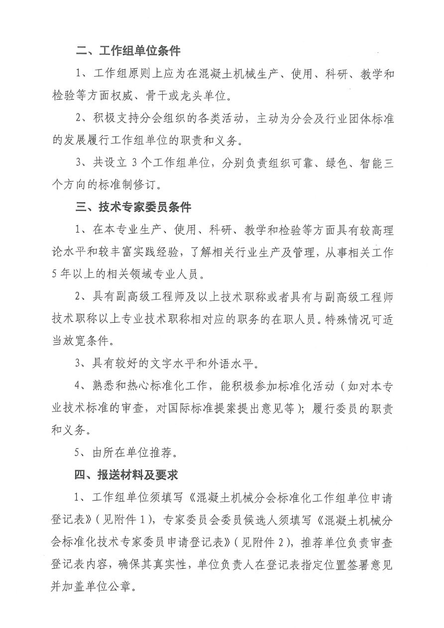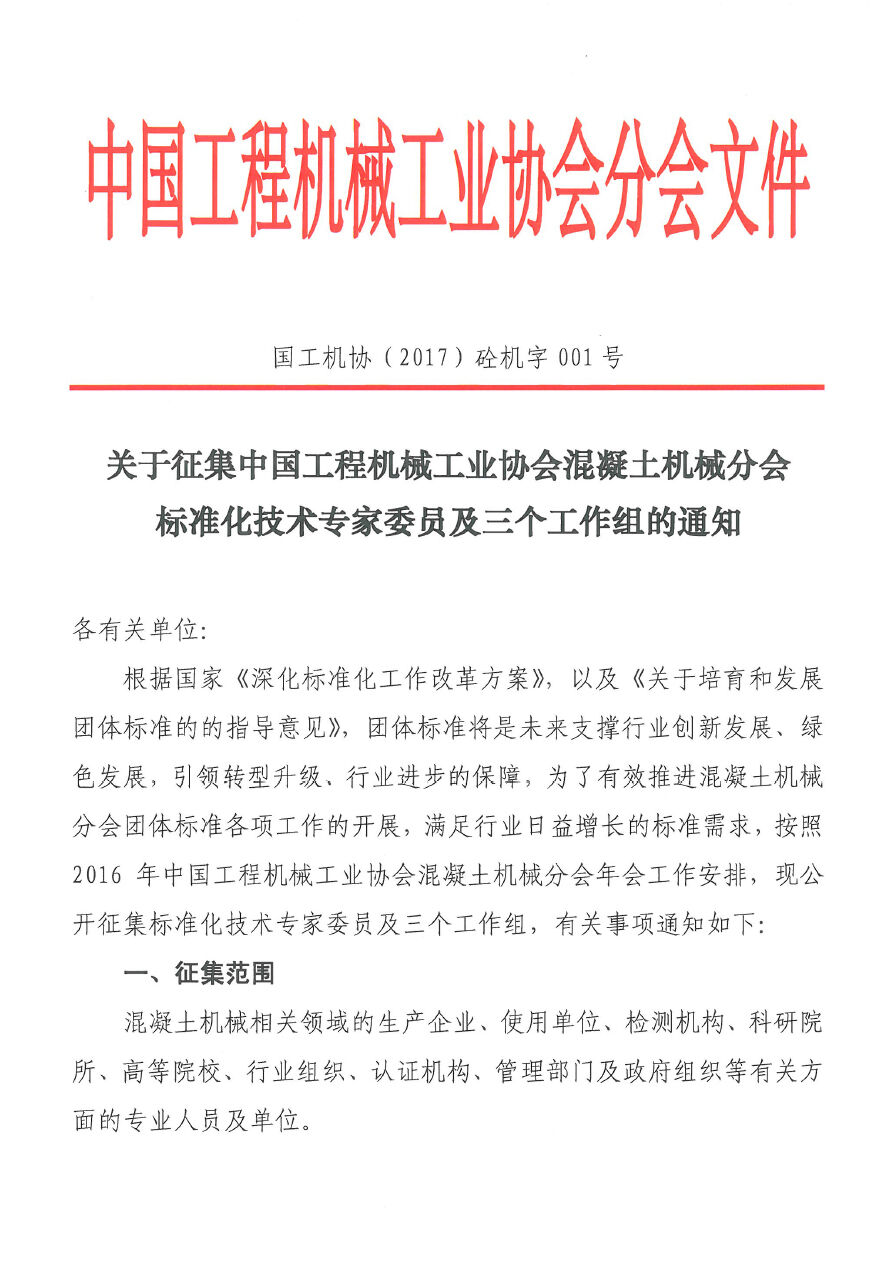 關(guān)于征集中國工程機械工業(yè)協(xié)會混凝土機械分會標準化技術(shù)專家委員及三個工作組的通知