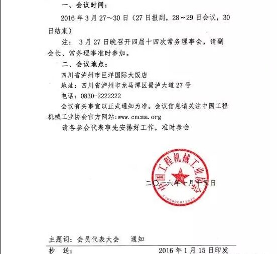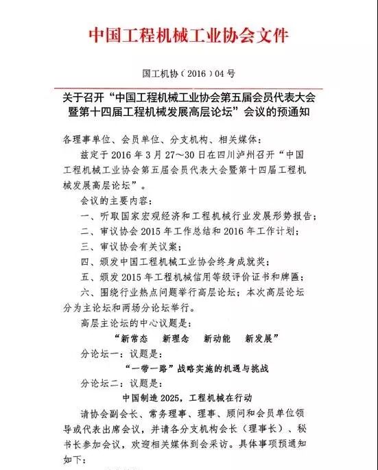 茲定于2016年3月27日~30日在四川瀘州召開“中國工程機械工業(yè)協會第五屆會員代表大會暨第十四屆工程機械發(fā)展高層論壇”。