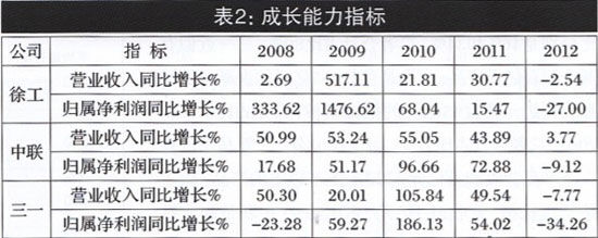 公司的成長與盈利能力正相關(guān)。在年報(bào)中,主營業(yè)務(wù)收入增長率、凈利潤增長率、凈資產(chǎn)增長率以及凈資產(chǎn)收益率、毛利率、凈利率等財(cái)務(wù)指標(biāo),是判斷企業(yè)成長性和盈利能力的重要指標(biāo)。表2顯示,三駕馬車中,5年主營業(yè)務(wù)收入同比增長率實(shí)現(xiàn)連續(xù)5年正增長、連續(xù)三年保持30%以上增長率的公司是中聯(lián),五年中增長率振幅最大的公司是徐工,2012年徐工和三—主營業(yè)務(wù)收入增長率均出現(xiàn)負(fù)增長;表2還顯示,凈利潤同比增長率方面,沒有—家公司連續(xù)五年正增長,2012年三駕馬車同時出現(xiàn)負(fù)增長,三一錄得-34.26%的最大降幅。在大環(huán)境不利因素作用下,公司成長性受到嚴(yán)峻挑戰(zhàn)(見圖2)。