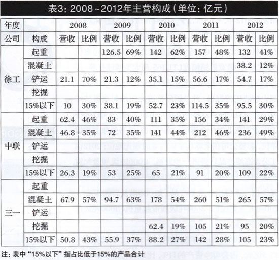 分析表3數(shù)據(jù),2012年?duì)I業(yè)收入超100億元的產(chǎn)品:徐工是起重機(jī),營收132億元、占到營業(yè)總收入4l%,其中占營業(yè)收入15%以上的產(chǎn)品還有鏟運(yùn)機(jī)械,占比17%、營收54.7億元;中聯(lián)有兩個營收超百億元產(chǎn)品,分別是營收236億元的混凝土機(jī)械和141億元的起重機(jī)械。占比分別是46%和34%,二者合計(jì)占比80%;三一近似有兩個超百億元產(chǎn)品,一個是營收265億元的混凝土機(jī)械和約百億元營收95億元的挖掘機(jī)械,分別占比57%和20%,二者合計(jì)占比77%?;赝?008年,三駕馬車沒有一個產(chǎn)品營收超百億元,其占比15%以上的產(chǎn)品:徐工是鏟運(yùn)機(jī)械,營收21.1億元、占比70%;中聯(lián)是起重機(jī)械、混凝土機(jī)械,占比分別是46%、35%,二者合計(jì)占比81%;三一是混凝土機(jī)械,占比57%。細(xì)分產(chǎn)品構(gòu)成,徐工的起重機(jī)主要以移動式起重機(jī)為主,在行業(yè)處于龍頭地位;中聯(lián)的起重機(jī)包含移動和塔式兩塊,其中塔式起重機(jī)是行業(yè)龍頭;在占比小于15%的部分,徐工有混凝土機(jī)械、壓實(shí)機(jī)械、路面機(jī)械等,中聯(lián)有土方機(jī)械、路面及樁工機(jī)械、環(huán)衛(wèi)機(jī)械等,三一有起重機(jī)械、路面及樁工機(jī)械等。