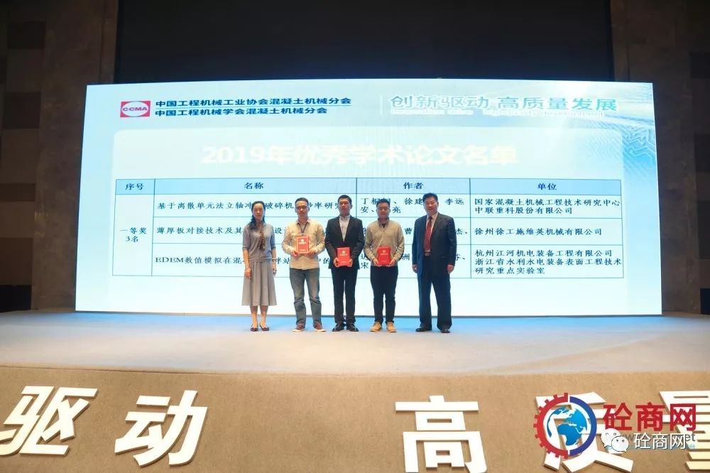 中國工程機(jī)械工業(yè)協(xié)會混凝土機(jī)械分會符忠軒會長以及中國工程機(jī)械工業(yè)協(xié)會混凝土機(jī)械分會顧問易君女士為優(yōu)秀論文一等獎獲得者頒發(fā)獲獎證書;